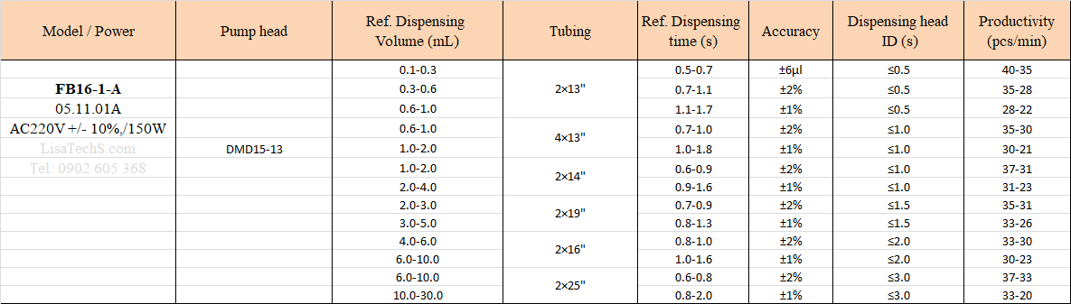 Thông số kỹ thuật để chọn bộ bơm nhu động chiết rót đa kênh FB16-1