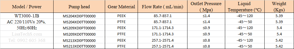 Thông số kỹ thuật để chọn bộ chiết rót dùng bơm bánh răng WT3000 Series