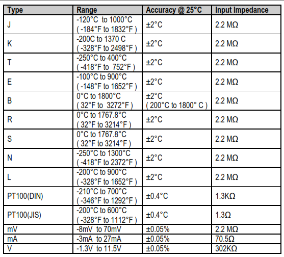 Thermocouples: J, K, T, E, B, R, S, N, L, U, P, W5, W3, LR, A1, A2, A3, M