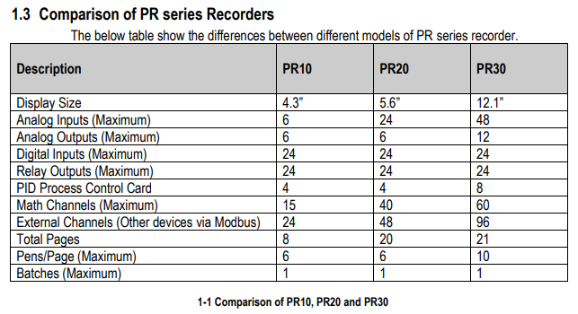 Bộ ghi PR serice vớ model PR30 mỗi thẻ card đầu vào có tối thiểu 6 chanels với PR30 người dùng có thể chọn số lượng kênh đầu vào tương ứng như sau, PR30XX,